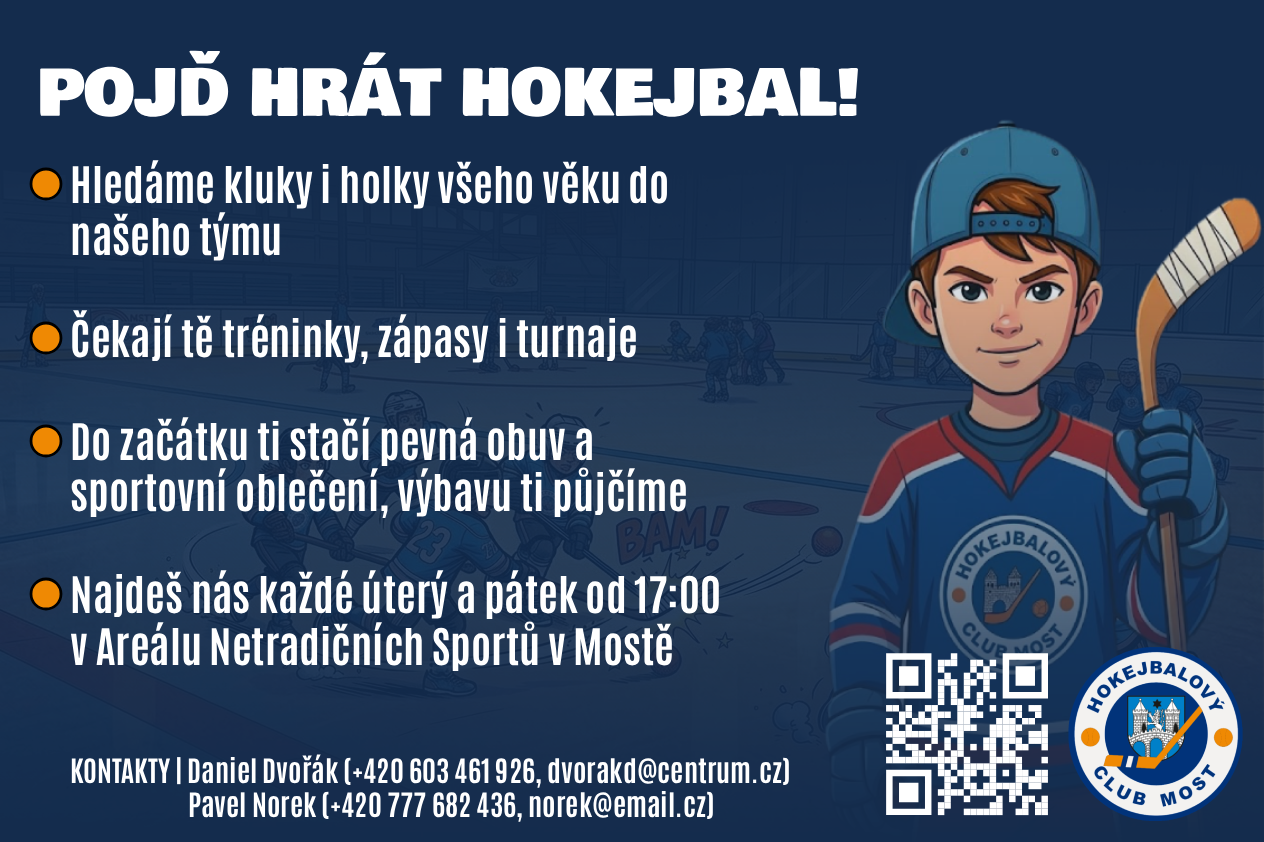 Hledáš sport, který tě zvedne ze židle, nabije energií a naučí tě, co znamená mít za zády opravdový tým? V Mostě máme hokejbal v krvi a teď hledáme právě tebe! Je úplně jedno, jestli už jsi někdy držel hokejku v ruce, nebo teprve hledáš ten správný koníček – u nás mají dveře otevřené kluci i holky všech věkových kategorií.